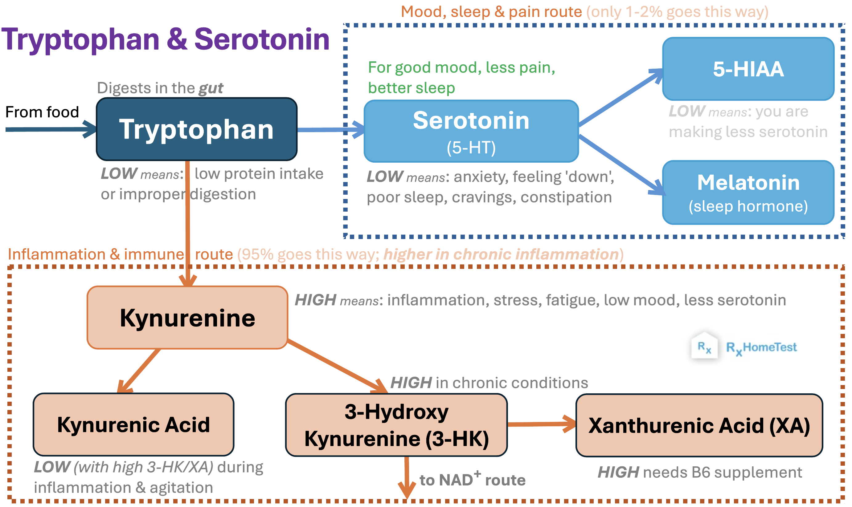 High kynurenine levels indicate problems such as inflammation, chronic stress, overactive immune system or gut dysbiosis (as tryptophan to kynurenine or serotonin conversion happens in the gut). Other reasons include infections,