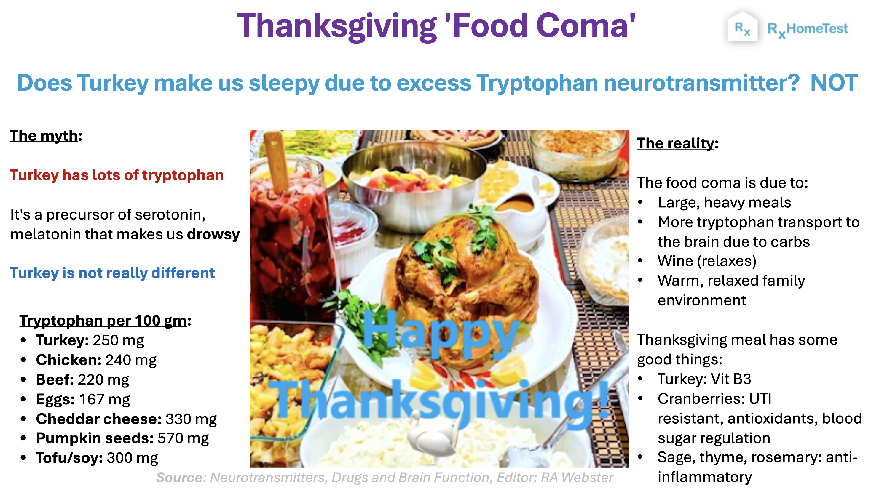 It is mistakenly assumed that food coma is due to tryptophan (especially around Thanksgiving and other holidays); however, the real reasons are heavy meals, alcohol, and the warm, relaxed environment.