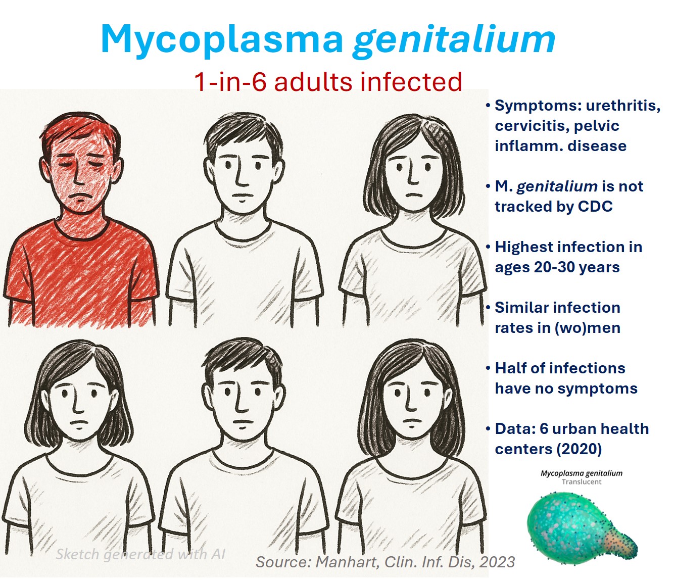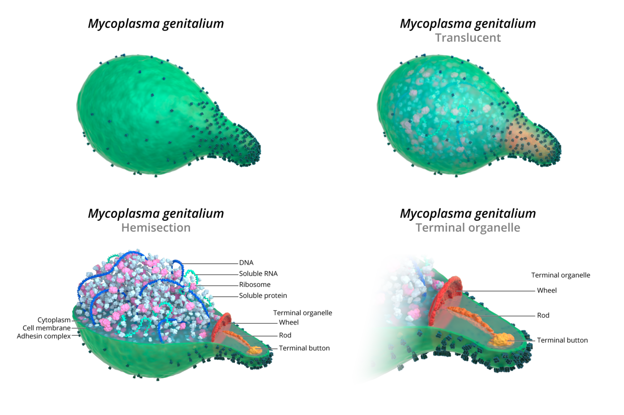 Mycoplasma genitalium: DNA of the pathogen that is very difficult to culture due to no rigid cell wall (see image below).